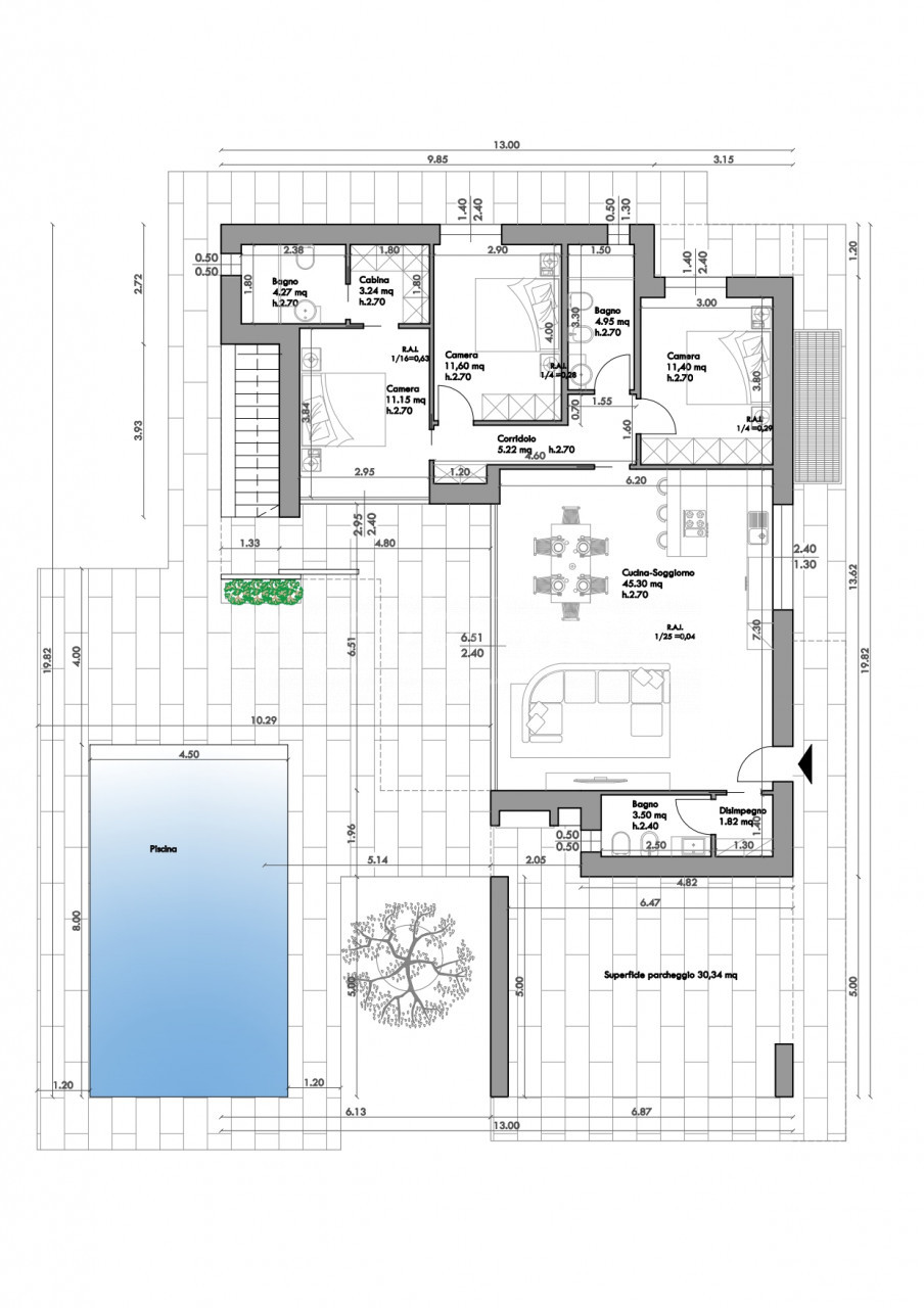 The villa is developed on a single floor with a total area of about 200 sqm. The interior spaces are designed to maximize comfort: a spacious living area with kitchenette, three bright bedrooms, and three windowed bathrooms ensure functionality and elegance. Outside, you will find an exclusive pool featuring an innovative water sterilization system using salt electrolysis, along with cozy porticos and well-kept private gardens equipped with an automatic irrigation system.