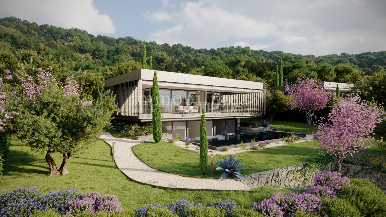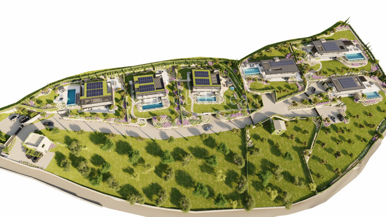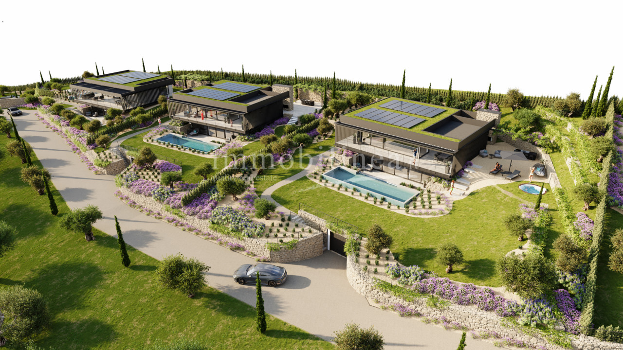 The villas are surrounded by meticulously maintained private gardens, enriched with Mediterranean plants and seasonal blooms. Outdoor spaces include covered terraces ideal for al fresco dining and private pools where you can relax in complete privacy. Green roofs integrate photovoltaic panels for high energy efficiency.
