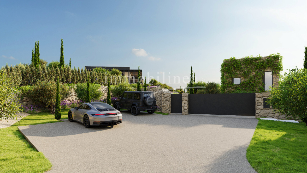 Access to the residence is via exclusive pathways bordered by characteristic local stone walls; entry is reserved for residents only, ensuring absolute security and tranquility. The private parking area comfortably accommodates prestigious cars.