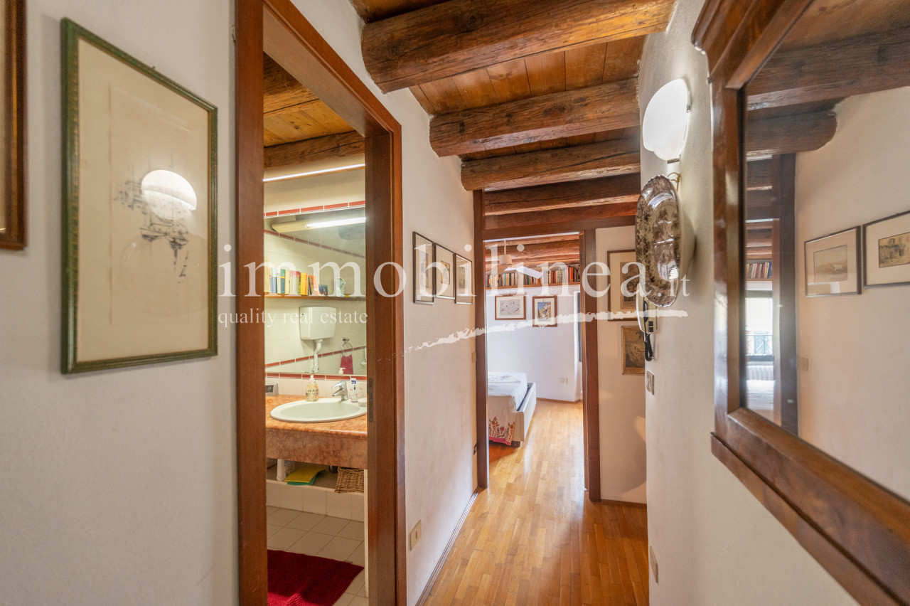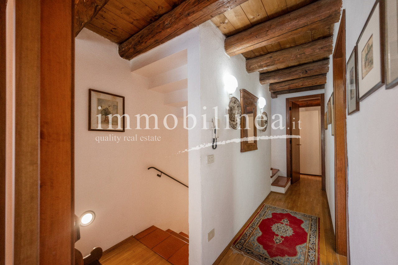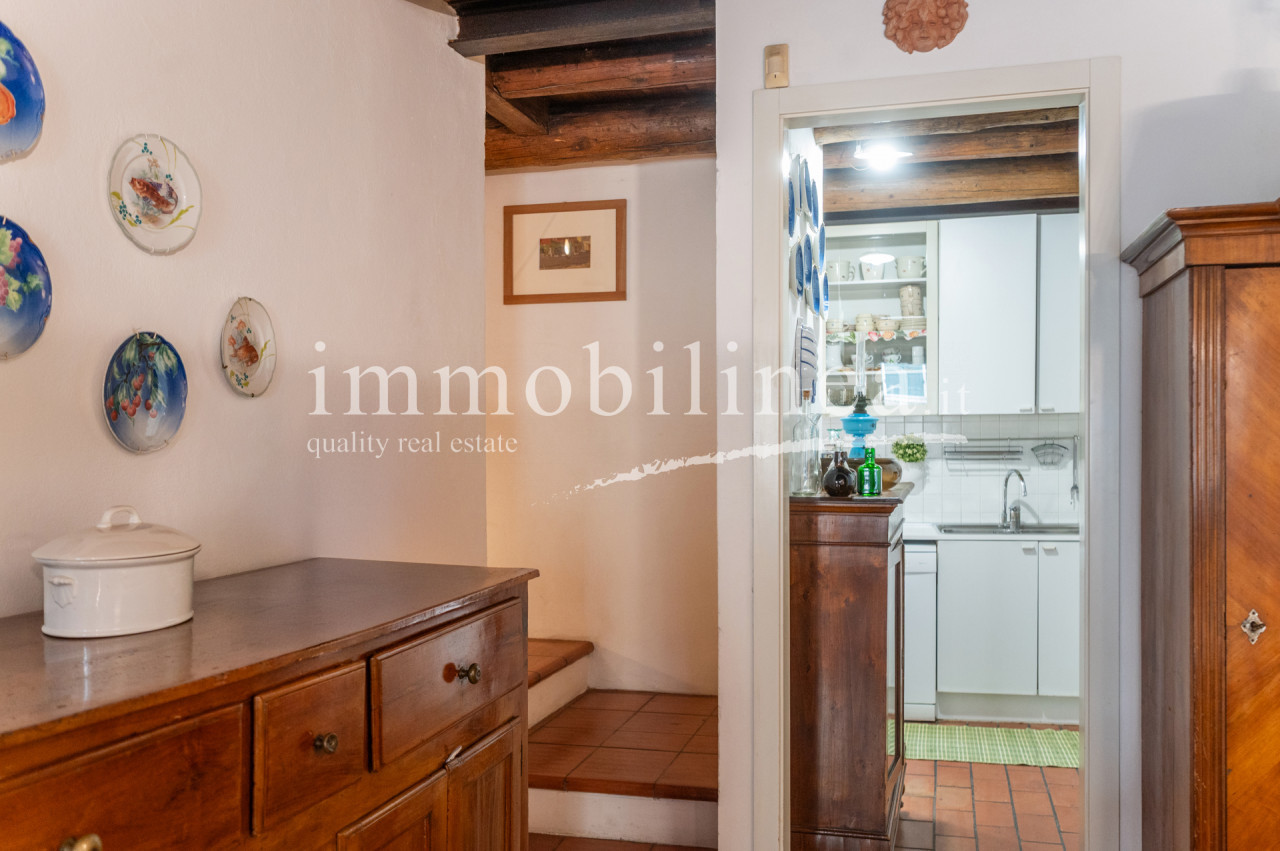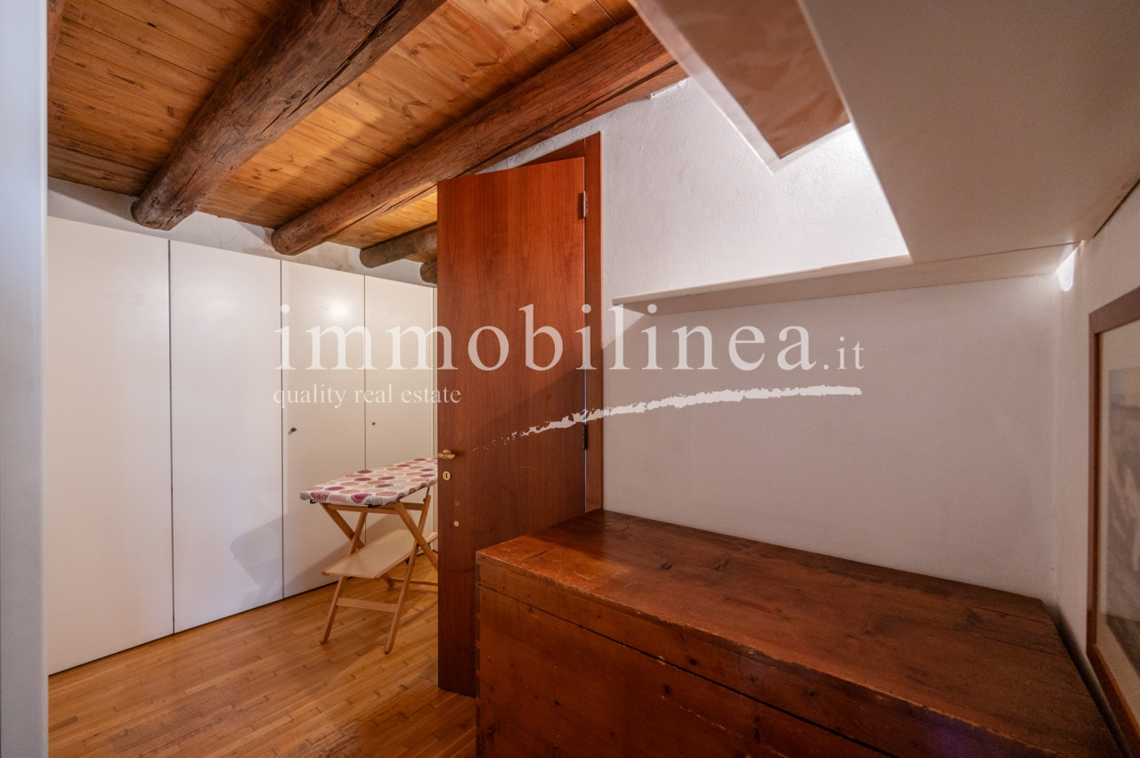 The building is developed over multiple levels. On the ground floor, there is a commercial space of about 45 sqm, currently leased and operational. The apartment has an independent entrance from 'vicolo cieco campanile' and features elegant finishes that reflect the typical architectural style of the area. On the first floor, there is a living room with a separate kitchen; elegant stairs lead us to the second floor where there are two bedrooms and the main bathroom, as well as to the attic which includes a storage room, a bathroom/laundry room, and a bright versatile open space. The interiors are characterized by windows that ensure natural lighting throughout the day, creating a warm and welcoming atmosphere. The layout is ideal for families or as an investment for hospitality activities; thanks to its central location all services are easily accessible.
